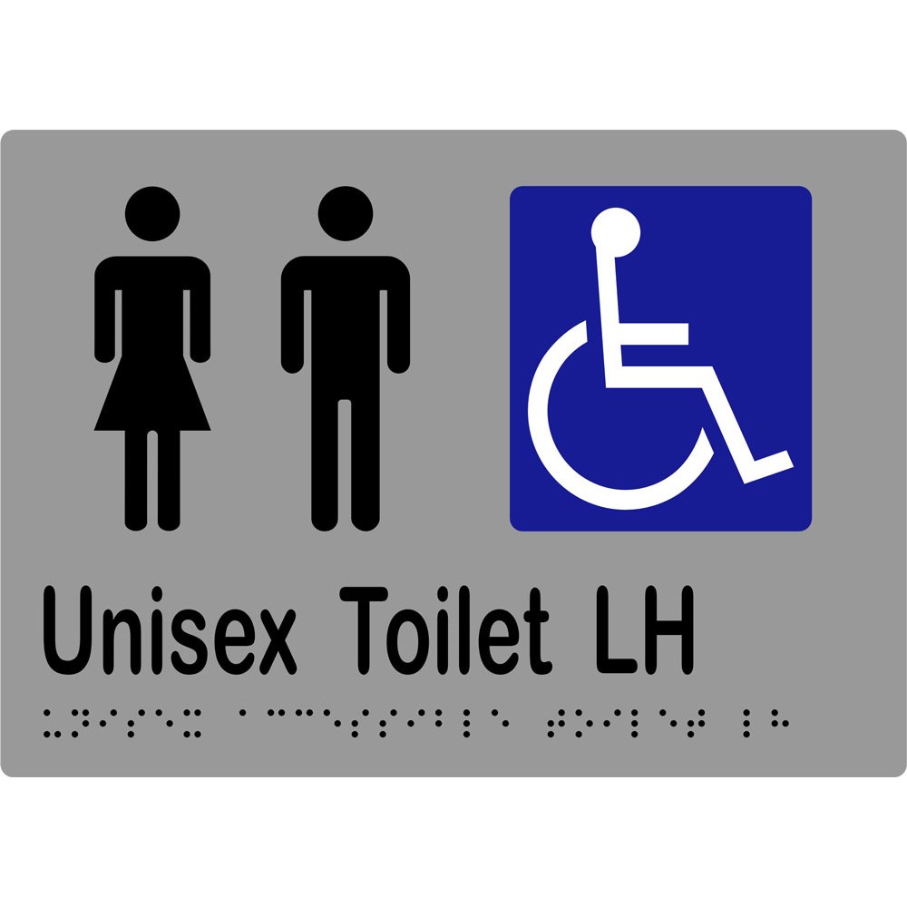 K-Jam Unisex acessible toilet sign left hand with braille 210x150 mm laminated vinyl silver over black.