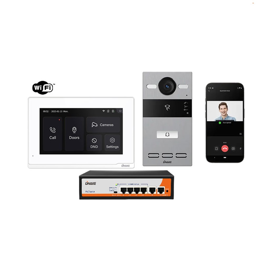 Enhance your security with the touch of a button. The DNAKE IP Video Intercom Kit is a complete, ready-to-deploy solution that includes a door station, indoor monitor, 4-Port PoE switch, and all mounting accessories. Setup is simple with guided step-by-step configuration wizards. Improve home security while adding everyday convenience with the DNAKE IP Video Intercom Kit.