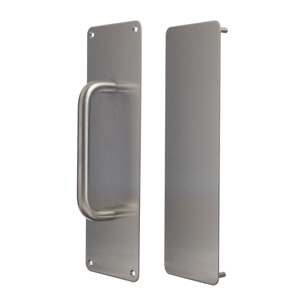 dormakaba concealed and visible fix stainless steel push and pull plates for fixing back to back through the door.