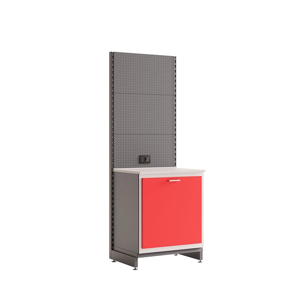 Silca Point shop display unit single cabinet with backing board and door.