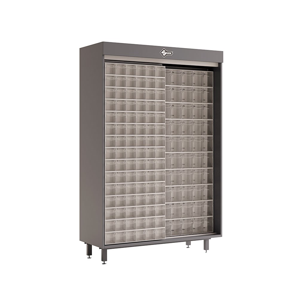 Silca Point shop display unit vertical storage unit with sliding multibox panels.